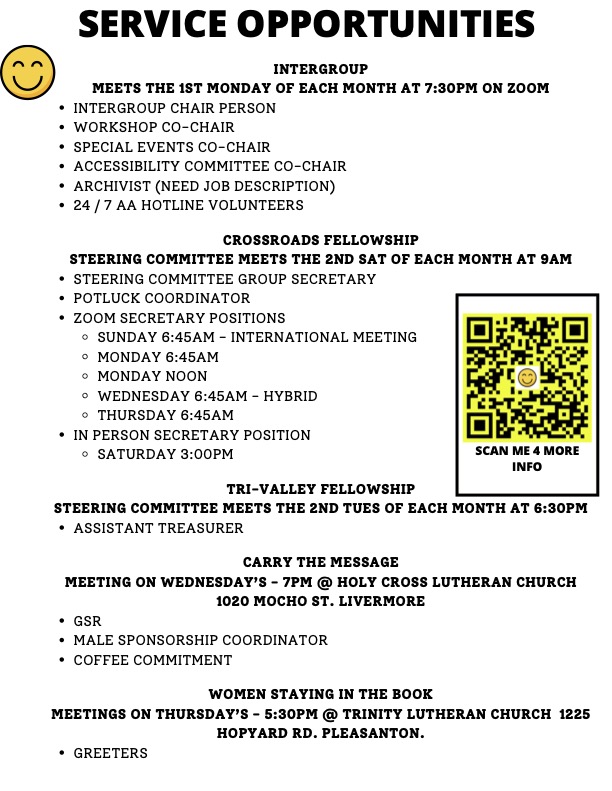The most vital, yet least understood, group of services that AA has are those that enable us to function as a whole…our worldwide unity and mch of our growth since early times are directly traceable to this cluster of life-giving activities. [excerpt from AA Service Manual, Appendix A, Legacies of Service, written by Bill W] We learn these things in workshops in the Valley Service area.